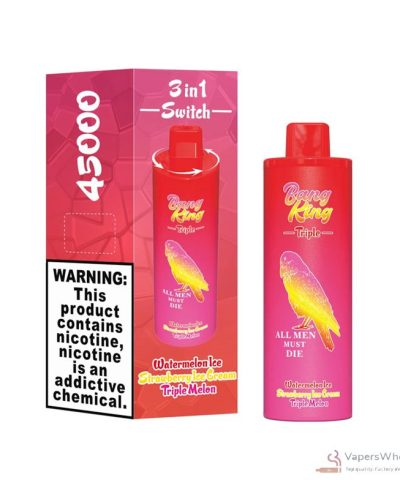 Bang King 45000 bouffées vaporisateur jetable triple saveur avec batterie rechargeable de 650mAh et options de nicotine 0%/2%/3%/5%. Caractéristiques trois bobines à mailles et Chargement rapide de type C pour des aventures gustatives prolongées.